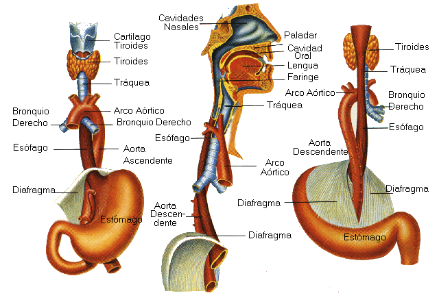 - El esófago es un conducto musculo membranoso que se extiende desde la faringe hasta el estómago. De los incisivos al cardias porción donde el esófago se continua con el estómago hay unos 40 cm. El esófago empieza en el cuello, atraviesa todo el tórax y pasa al abdomen a través del hiato esófagico del diafragma. Habitualmente es una cavidad virtual. (es decir que sus paredes se encuentran unidas y solo se abren cuando pasa el bolo alimenticio).