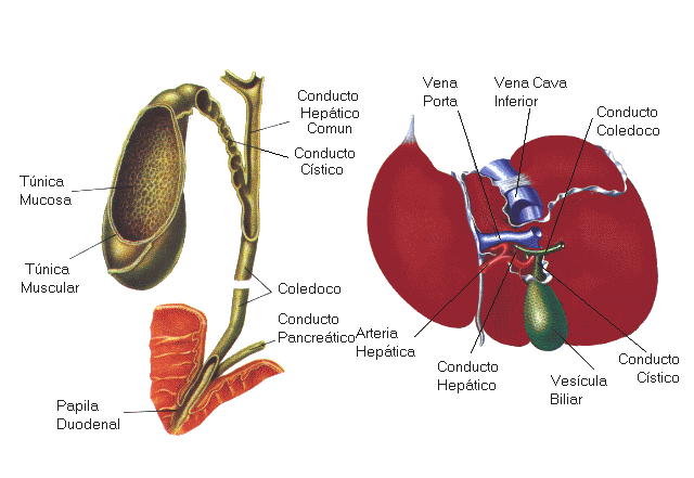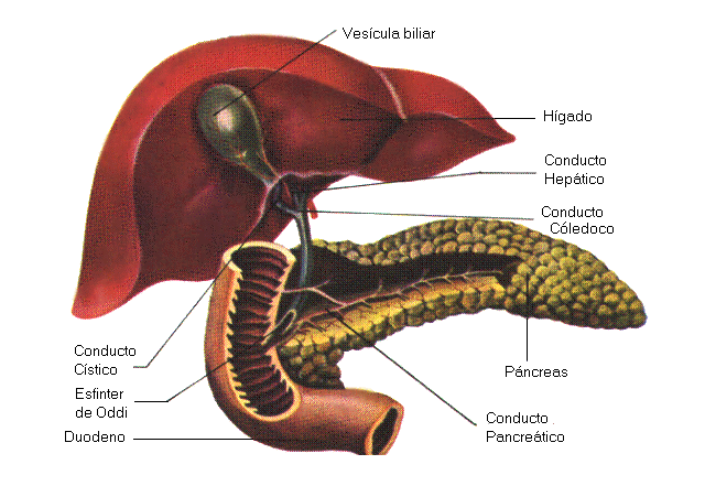 - Es la mayor viscera del cuerpo pesa 1500 gms Consta de dos lóbulos. Las vías biliares son las vías excretoras del hígado, por ellas la bilis es conducida al duodeno. normalmente salen dos conductos: derecho e izquierdo, que confluyen entre sì formando un conducto único. el conducto hepático, recibe un conducto más fino, el conducto cìstico, que proviene de la vesícula biliar alojada en la cara visceral de hígado. De la reunión de los conductos cìstico y el hepático se forma el colèdoco, que desciende al duodeno, en la que desemboca junto con el conducto excretor del páncreas. La vesícula biliar es un reservorio musculomembranoso puesto en derivación sobre las vías biliares principales. No suele contener mas de 50-60 cm de bilis. Es de forma ovalada o ligeramente piriforme y su diámetro mayor no es de 8 a 10 cm .
