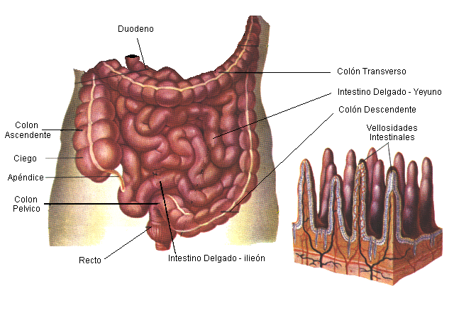 El tubo digestivo continua por el intestino grueso, de algo mas de metro y medio de longitud. Su porción final es el recto, que termina en el ano, por donde se evacuan al exterior los restos indigeribles de los alimentos.