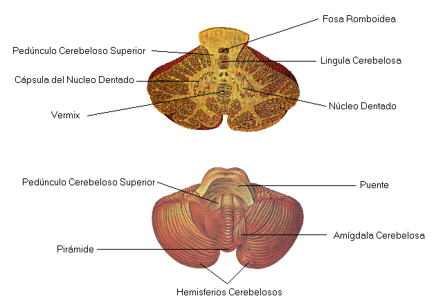 - Esta situado detr�s del cerebro y es m�s peque�o (120 gr.); tiene forma de una mariposa con las alas extendidas. Consta de tres partes: Dos hemisferios cerebelosos y el cuerpo vermiforme. Por fuera tiene sustancia gris y en el interior sustancia blanca, esta presenta una forma arborescente por lo que se llama el �rbol de la vida.Coordina los movimientos de los musculos al caminar.