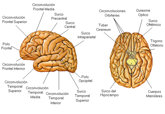 - Es la parte mas importante, esta formado por la sustancia gris (por fuera) y la sustancia blanca (por dentro), su superficie no es lisa sino que tienes unas arrugas o salientes llamadas circunvoluciones; y unos surcos denominados cisuras, las mas notables son llamadas las cisuras de Silvio y de Rolando. Esta dividido incompletamente por una hendidura en dos partes, llamados hemisferios cerebrales. En los hemisferios se distinguen zonas denominadas l�bulos, que llevan el nombre del hueso en que se encuentran en contacto. Pesa unos 1.200gr Dentro de sus principales funciones est�n las de controlar y regular el funcionamiento de los dem�s centros nerviosos, tambi�n en el se reciben las sensaciones y se elaboran las respuestas conscientes a dichas situaciones. Es el �rgano de las facultades intelectuales: atenci�n, memoria ...etc.