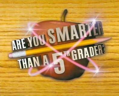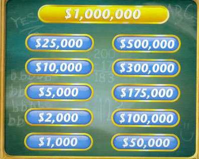 | A Mark Burnett Production in association with Zoo Productions air dates: 2/27/07-present on Fox primetime host: Jeff Foxworthy HOW TO PLAY: One contestant attempts to answer 11 questions from the 1st-5th grade levels and win $1,000,000 with help from 6 5th-grade students. The contestant chooses one 5th-grader to be his/her classmate for the first 2 questions. The player picks one of 10 subjects, 2 different subjects for each of 1st-5th grade, displayed on the screen. The player and the classmate are both asked the same question and the classmate secretly writes his/her answer on a slate with an electronic pen. If the player wishes, (s)he may use a "cheat" before locking in with an answer. Each "cheat" may be used only once during the game. Peek: The player may see the classmate's answer. Copy: The player must lock in with the classmate's answer. Save: If the player locks in with a wrong answer, the classmate's answer must be correct in order for the player to continue in the game. After every 2 questions, the player must choose a new classmate. The prize money for each correct answer increases as follows, starting at the bottom of the left column and then the right column: |