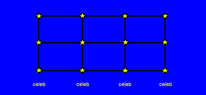 | A Merrill Heatter Production in association with Peter Marshall Enterprises air dates: 4/8-12/20/85 on ABC daytime host ("The master of the Blitz Board"): Peter Marshall announcer: John Harlan HOW TO PLAY: Two contestants faced a board of six screens, arranged in two rows of three each. Four celebrities were seated underneath the board. Each celeb sat beneath a column of three stars. |