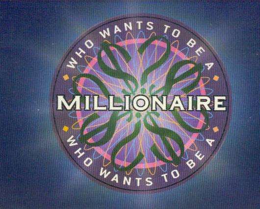 | packager: Celador Productions ('99-'08), 2waytraffic ('08-) in assoc. with Valleycrest Productions air dates: ABC primetime 8/16/99-2002 & occasionaly from 2/04-5/04 (Super Millionaire), syndicated 9/16/2002-present by Buena Vista Television ('02-'08) and Disney/ABC Domestic Television hosts: Regis Philbin (ABC), Meridith Vieira (syn.) HOW TO PLAY: On the hour-long ABC version, each show started with ten contestants seated at their podiums. Each podium featured a moniter with DEL, A, B, C, D, and OK buttons. Regis then presented a "fastest finger" question with four answers to put in the right order. The player who put those answers in the right order in the fastest time won their way to the "hot seat." This is were winning money comes in. The contestant must correctly answer 15 questions, which increase in difficulty, in order to win a million bucks. A question is presented along with 4 possible answers. Once the player decides on a final answer, that answer is locked in and can't be changed. If correct, the winnings increase. If not, the game is over. The values of the questions increased as follows: $100, $200, $300, $500, $1,000, $2,000, $4,000, $8,000, $16,000, $32,000, $64,000, $125,000, $250,000, $500,000, and finally $1,000,000!! Once the player reaches an amount indicated in bold, the player is guaranteed at least that much money. If the player misses any of the next 5 questions, (s)he ends up winning that amount. A player who misses any of the first five questions leaves with zilch. If at any time the player is unsure of an answer, (s)he may stop and protect his/her winnings. In order to help the player win as much as possible, (s)he is given three lifelines at the start, each of which can only be used once: |