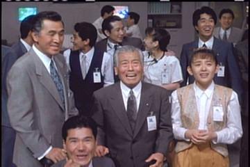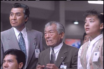 Miki looks appropriately worried, while the guy on the left looks like your dad's dull golf buddy. Dobashi, however, looks so tense and wrapped up in the monster fight he's watching that it looks as if it's all he can do to keep his head from flying off his body like a cork.