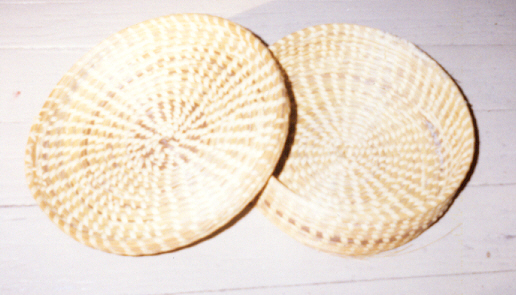 | Coiled, handmade baskets of sweetgrass (sew with longleaf pine needles and strips of palmetto leaf) command good prices at roadside stands or on the City Market and streets of Charleston, Slaves had been making coiled baskets (an African technique different from the European weave) since the late 1600s, and the Sea Island baskets were related to those of Angola, Senegambia, and the Congo. The most common material was formerly black rush (a marsh grass) bound with strips of white oak or saw palmetto stem. Sweetgrass become popular only at the beginning of the twentieth century, when a black community in Mount Pleasant (across the Copper River from Charleston) began making 'show baskets' from the material. There baskets provided welcome income in the aftermath of recent hurricanes and boll weevil infestation. Tourists bought so many of the baskets that sweetgrass won out over more traditional choices. On St. Helena Island, however, rush work baskets continued into the first half of the twentieth century. Though the Penn School offered training in 'Native Island Basketry' for fifty years, today black rush is used mainly to strengthen and decorate certain types of sweetgrass baskets. The early rice industry in the Lowcountry owed its success to a particular type of black rush basket, the 'fanner'. Slaves 'fanned' threshed rich into the air from the baskets to let the wind separate the chaff. On the plantations, the male slaves wove fences, granaries, traps, and heavy field baskets, while the women made the smaller, fancier baskets for the households. |