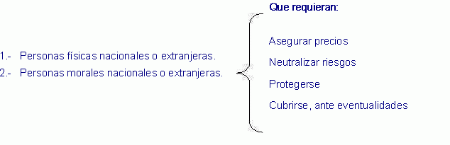 En México se refiere principalmente a la compra-venta a futuro de dólares, tasas de interés y otros instrumentos autorizados, que se realizan directamente entre participantes e intermediarios, entendiéndose como participantes a las personas físicas nacionales y extranjeras y los intermediarios a las instituciones de crédito o casas de bolsa que obtienen autorización por escrito del Banco de México para realizar operaciones de compra-venta con otros intermediarios y participantes.