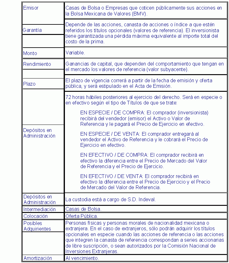 Títulos Opcionales (warrants): Es la denominación que las Autoridades Financieras le dieron a los instrumentos que internacionalmente se denominan como warrants. Son instrumentos que conceden a su tenedor, pero no la obligación, de comprar o vender otro título o canasta de títulos o un índice de precios, denominado como valor subyacente a un precio establecido con anticipación y durante un periodo determinado. Al igual que las opciones, pueden ser títulos opcionales de venta (put) o de compra (call) y se ejercen en especie o efectivo, de acuerdo con las estipulaciones del acta de emisión.