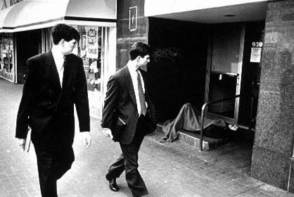 - One American Reality, 2 business men passing by a Homeless. I was standing in their way at the moment.