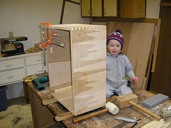 Here's our little helper holding things together. The basic box is made with void free birch plywood. The edges are fitted with finger joints and braced with 1" poplar supports. |