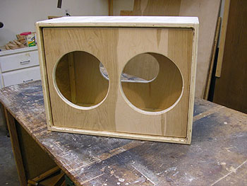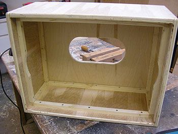 | Once the edge joints dry, the box was framed out with poplar and the front and back panels were fitted. Notice the partial venting on the back panel. Also, notice the recess in the side of the front panel supports. The recesses were needed to allow clearance for the drivers and still meet the overall dimension requirement of the box. | ![]() |