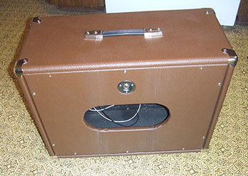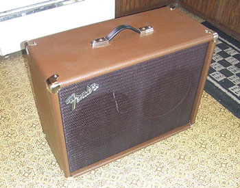 | My friend finished the box with brown vinyl, chrome corners, a nice strap handle, brown grill cloth, and a spare Fender emblem. Nice touch! | ![]() |