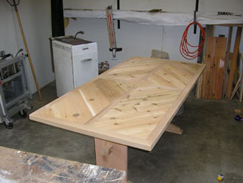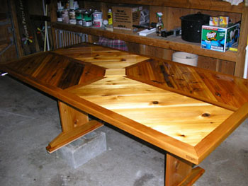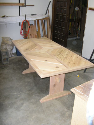 | Another shot of the table before finishing. The cedar fence material had plenty of knots to deal with, but we feels those knots give the table some added charactor. Although, those knots gave our hand planes and hands something to remember the project by. Ouch! |