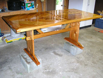 Here is the table with the second coat of finish. There will be wedges in the cross member when the finishing is complete. |