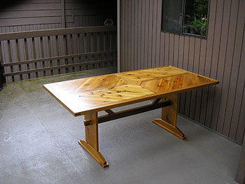 | Here is a fantastic creation from the Wood Shop. This Cedar Outdoor Trussel Table was custom designed to use mostly mortis and tenon joinery and tongue and groove table top panels. The entire table was made with cedar fence materials that were hand planed to thickness. |