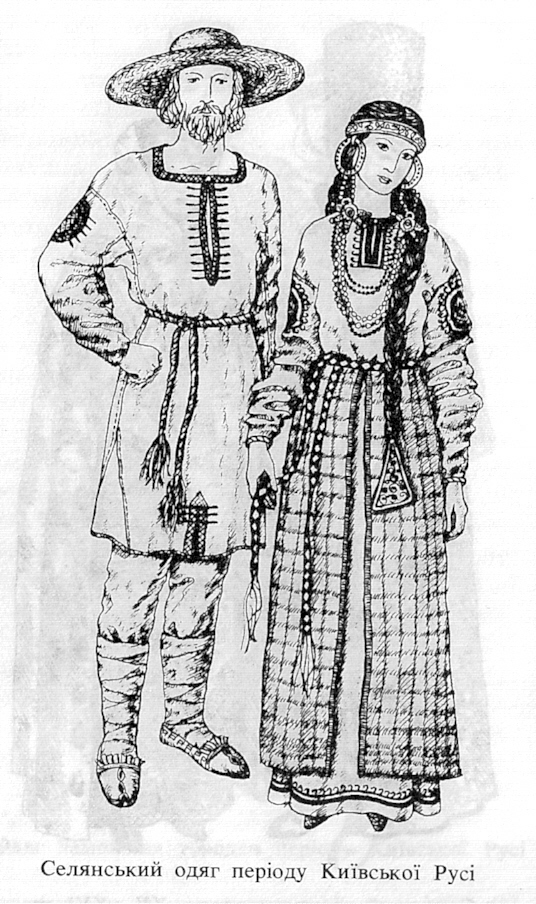 | Image 1: Typical outfits for early Kievan Period - pre-Christian. The man is wearing a rubakha shirt. The maiden has on a full length rubakha with a panova over it. Her circlet is called a nachil'nika. You can tell she's an unmarried woman because her hair is uncovered. | ||||||||||||||||||||||||||||||||||||||||||||