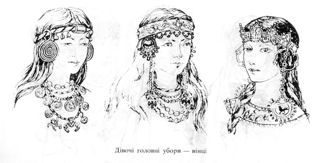 | Image 3: Various headwear for Kievan maidens, starting with the common on the left made of a leather band, upperclass in the middle made of embroidered silk ribbon glued to a birchbark or leather base, and princess on the right, hers made of precious metals and gems. Note also the necks: The common woman wears beads and amulets, the upperclass woman wears necklaces of finer gems, and the princess has an ornately embroidered and bejeweled neckline on her gown. | ||||||||||||||||||||||||||||||||||||||||||||