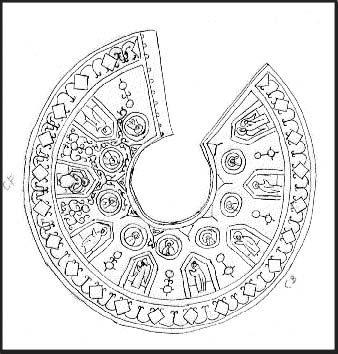 | Image 6: Another larger image of an ozherl'ya like the one above. Note the essentially religious nature of these decorations: depictions of saints and archangels. This example is probably from the later Kievan period, when religious decoration on garments flourished. The ozherl'ya in the above picture has more of a stylized decoration of vines and floral motifs. | ||||||||||||||||||||||||||||||||||||||||||||
