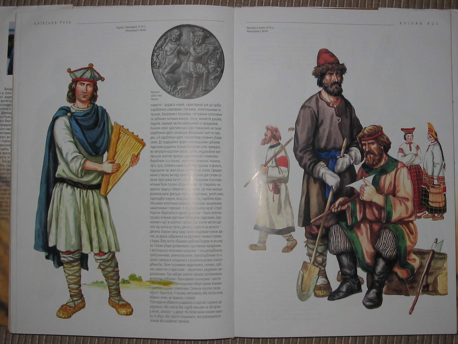 | Image 7: Late 10th C. On the left, a minstrel with his gusli, an instrument similar to the psaltery. On the right, two townsmen, clearly craftsmen. And in the background, another peasant farmer and a pair of peasant women from the southernmost reaches of the principality. | ||||||||||||||||||||||||||||||||||||||||||||
