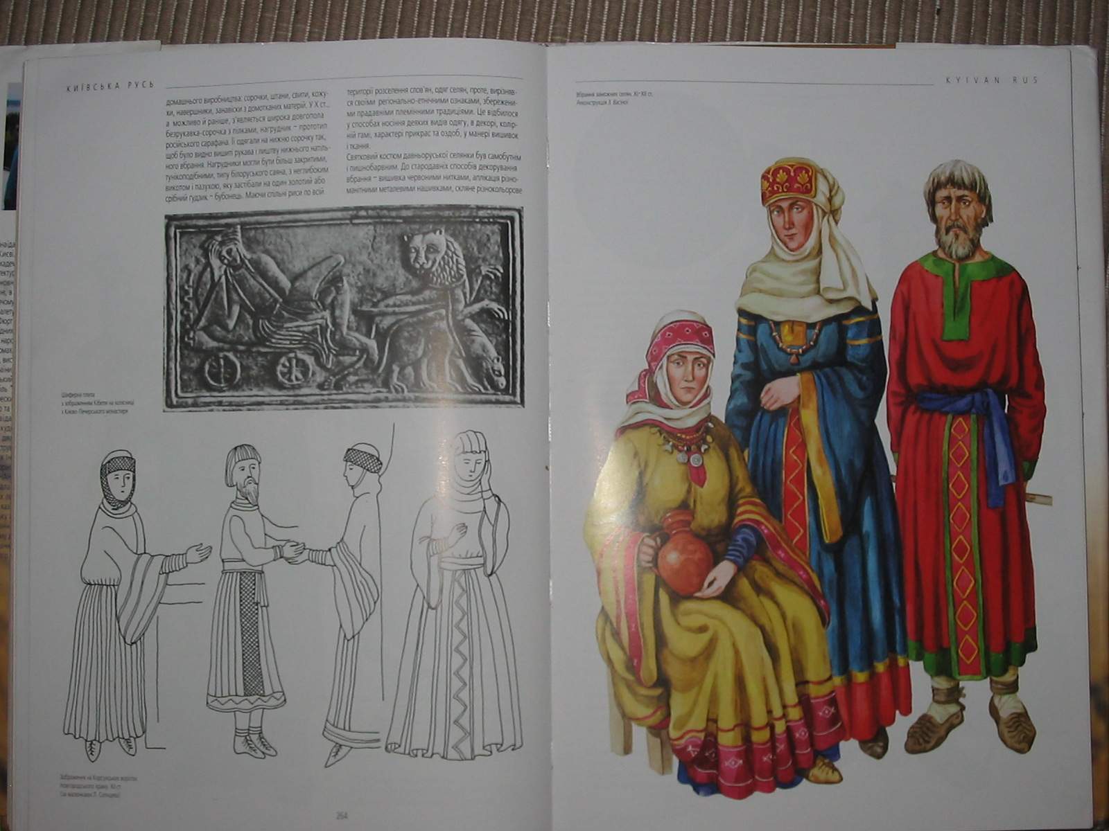 Image 2, below: Late Slavic, very early Kievan. Note the brocade overdress on the noble woman on the left of the trio. This indicates contact with Byzantium, since Russia did not have a native industry capable of producing brocade unless by extensive hand embroidery. In this image we begin to see the static and smoother lines of the clothing which so typified Kievan fashion. |