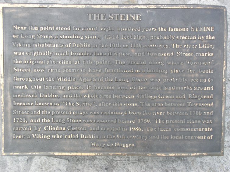 The name of "the Stein" is not found in Irish manuscripts or any record earlier than the Anglo Norman invasion of Ireland. In fact the Irish knew it a "the Green of Ath Cliath" and alluded to it as a place where Brian Boru held council with the nobles of the Dal Cais (Wars of the Gaedhil with the Gaill, Rev Dr Todd, 1867). While the Anglo Norman monks rarely, if ever, used an Irish name when any other existed, and invariably called the city and even the provinces by their Scandinavian names.