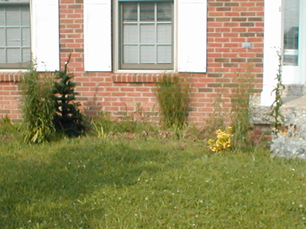 | Although not everyone can enjoy the view of the back yard (see other pictures), we can all marvel at the *clever* use of artificial shrubbary used in an unsuccessful attempt to mask the over-grown weeds sitting where the perfectly decent shrubbary was before they were removed. By the way, I just love the *professional* white paint job added by the family kids on the porch, shutters, and garage that, while not matching any of the rest of the existing trim, somehow solidifies my opinion of this incredible display of horticultural neglect. |