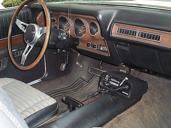 | Exteriorly, you can see some of the options she has: bright exhaust tips, front and rear spoilers, 15x7 Ralleys, wheel-lip moulding, door guard moulding, white vinyl top, stripe delete, hood pins and concealed headlamps. | ||||||||||||||||||||||||||||||||||||