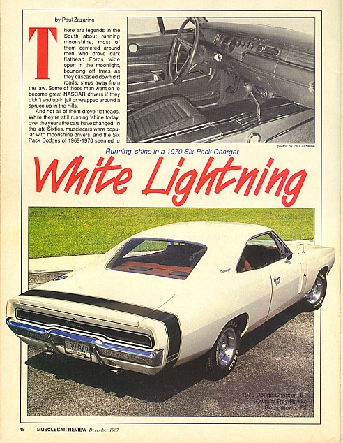 | This is the title page of the article Musclecar Review did on my 1970 Charger R/T back in Dec. 1986. It was cool getting her in a magazine.The following pages show the way I found her in about 1985. I paid $1800 for her then and I could have probably gotten her cheaper.. But, I wasn't going to haggle over this.. After all, she had front disc brakes !!!!!!! This journey started after I had finished restoring my '68 Charger I had had for a couple of years. Now, I wanted an original Mopar musclecar and a friend had a '69 Superbee 383 auto car for me to look at. When I got there, the 'Bee wasn't exactly what I thought it would be..... I had driven from South Florida to Knoxville, Tn, so, it wasn't around the corner. My friend took me over to this guy's house that at literally over 20 to 30 Mopar musclecars. I walked through the fields to come across 4-speed Charger R/T's, a factory lightweight Max-wedge car on a trailer, ragtop b-bodies and other e-bodies.. Again, it was the disc brakes that caused me to buy her. Back then, there wasn't anything about 1 of 1 and production numbers. I was surprised to find it was a "V" code car. At the time, I didn't even realize how uncommon she was. Boy, I do miss that car. She was my daily driver for over 3.5 years. I eventually passed on the daily driving tasks to a '69 Road Runner I bought in Dallas out of the autotrader for $1000, a running driving car.. I eventually was to trade her for my current 1968 Charger R/T equipped with a 426 HEMI / 727.. |
