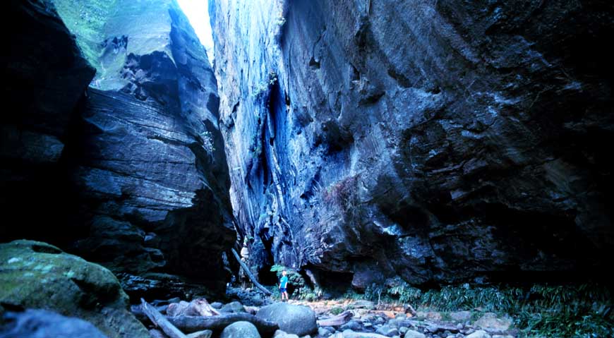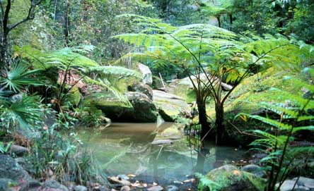 There is a small 'Squatters' Dining Room' and bar semi-surrounded by shady decks. The atmosphere is comfortably casual and the menu and wine list modest but sufficient. Our bus- and train-lagged troop vanished to their respective cabins to freshen up and re-apply fragrance and make-up. I went in search of Craig Ilsley the local chopper pilot who I was told would give me the 'ride of my life.' Of Peter there was no sign. "He's gone bush," I was told, knowingly. I found the veteran bush pilot warming up his machine a short distance up the road from the Oasis. The first thing you notice about Greg's whirlybird is that it has no windows. "That increases the 'wow factor,'" he shouted through the intercom. This is seat of your pants stuff. Ilsley has flown small choppers all over Australia. Not just your 'up and down, don't frighten the pants off the punters' stuff, but aerial stock-mustering, feral pig shooting and the like. He knows how to fly. Pretty soon we were swooping through chasms and dissecting the stalagmite-like peaks. I peered down between my knees into hidden pockets of rainforest. It's like the roller coaster ride you always dreamed of. To Greg, who admits to never getting sick of the sight, it's all in a day's work. Back at the Lodge I bumped into Peter. Has he ever flown over his beloved Carnarvon? "Nope, only ever been in a chopper once in my life." Would he like a trip up there I asked. "Oh yeah, wouldn't mind," he replied with little obvious enthusiasm. I talked to Craig. "No worries mate." We decide to do the trip tomorrow as the weather is closing in. "I'd like to land on one of those spurs," I added without much hope of a positive reply. "No worries mate", he replied airily, and added as a slightly chilling afterthought, "I s'pose you ARE insured". Another bloke who doesn't waste words. That evening after a short excursion into the bush the ladies were scrubbed up and ready for another evening's merriment. We fell-to upon lemon pepper perch, rib fillet steak, macadamia nut crusted pork fillets and Asian chicken stir-fry washed down with a Grant Burge Cabernet and a Rosemount Show Reserve Chardonnay. But as the evening wore on even the most energetic were flagging. Corinna and The Itinerary were threatening an early start. We