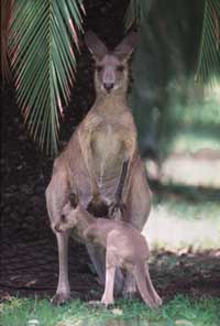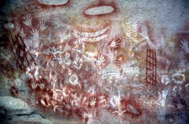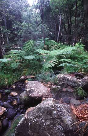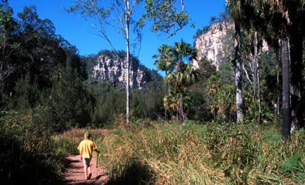 were to be marched up through the Carnarvon Gorge to the Aboriginal Art Gallery with various stops in between. And so to bed, tripping over a slumbering kangaroo on the way, to listen to the possums crashing about playing chase on the tin roofs of our chalets. Once more I (and I suspect the rest of our troop) was aroused by a shadowy figure energetically thumping on the door with an overly cheery, "It's 5.30, up and at 'em." Amassing in darkness, at the restaurant we were issued by even chirpier staff with back-packs, water bottles and a breakfast pack and were given instructions on what to do if we got lost. "Don't panic, stay where you are and we'll come and find you, sometime or other," grinned one of our drill-masters. Our assembly wandered around in circles bumping into each other and yawning good mornings. Some of last evening's die- hard party animals were nursing sore heads and distributing yet more Panadol. A sprightly Corinna was out in the gloom rounding up stragglers. Our leader was Brendan Moody. A tall, swarthy, and judging by some of the whispered comments from the ladies, an acceptably handsome National Parks and Wildlife Ranger.