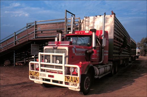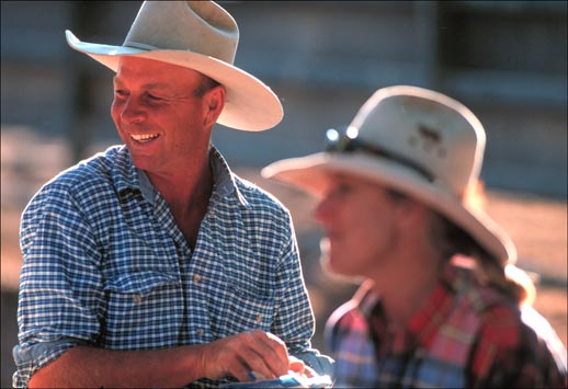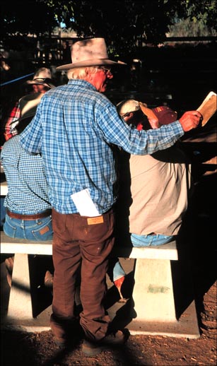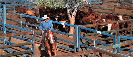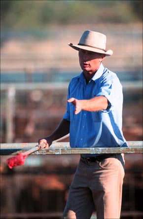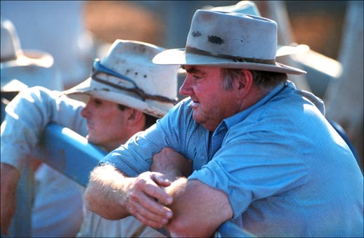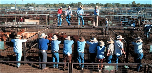 The lanky cattleman has just completed his daily war of nerves with the rough and tough cattle buyers of Western Queensland. He‘s feeling a bit parched. It’s been another record day of sales at Longreach’s cattle yards. ‘The Gun’ is tired, hot, and dusty and exudes a faint sweet bovine aroma of cattle and the raw scent of human sweat. The Landsborough Highway the main artery out of Longreach trembles from the constant caravan of huge triple trailored road trains floating on a hundred tyres each with two decks crammed with cattle. These mechanical behemoths are constantly on the move shifting over 100 beasts at a time. The blast of air horns reverberates through the pub signalling another bellowing load heading East to the coast for processing. It’s all sweet music to Simpson’s ears hidden, as they are, somewhere beneath his sweat rimmed and battered hat. The day has been successful for Simpson. Over 4000 cattle were pushed through the yards that day. The likes of which no one, including Simpson has never seen before. Beef is big news in the West and the world can’t get enough of prime Aussie steaks. Auctioneering is not for the faint hearted or the slow witted. It’s a war of nerves, intimidation and sheer cunning. There is no physcological quarter given. The shrewd buyer wants the best price he can get and so does Simpson, so hard heads lock horns and it’s on for young and old. He talks of mental duels, ‘holding hands’, fear tactics. It’s baffling to the outsider but it’s Simpson’s job to out think his opponents and theirs to out wit him if they can! There are big bucks out there for big beef. “t’s all to do with mental concentration, confrontation, holding your ground and of recognising body language. How your opponent moves, how he paces up and down”, continues Simpson washing the dust from his parched throat. “At the end of the day it’s who has the most guts”. The quietly spoken auctioneer is not short of intestinal fortitude himself - he cut off his own fingers once. They had become trapped in a plough. Ultimately it all comes down to how much you pay for your premium T-bone or rump-or your McDonalds. Millions of dollars pass through the yards every year. The statistics (like the country they emanate from) are huge. Telephone numbers long. A scruffy looking bunch that would look seriously out of place in a metropolitan glass tower trades big dollars. But out here business is as normal. And with out the necessity of an Armani suit. These men and women represent the boardroom of the West. Good mates spend the day trying to out phase each other. The shuffling audience of buyers, enshrouded by dust and, by late afternoon suffering from a serious thirst, inspect pen after pen orchestrated by Simpson conducting from the catwalk and watching for a feint here, an intimation there. Any advantage. Point two of a cent might not sound like much but miss a nod or an almost imperceptable wink and money is lost or won depending on which camp you belong to. “We did sixty million dollars in cattle alone last financial year and we sold 360,000 head of sheep at around $25.00 a head”, confides Simpson who out of necessity has the memory of your average computers hard drive. The massive boom in cattle sales is unprecedented and recently the yards have been enlarged to take the load. The Longreach complex is a maze of steel walkways and 258 pens. The complex is worth 1.5 million and has been up graded to cope. “We sell clean cattle out here. We are tick free with little use of chemicals and we are the crossroads in Longreach for all central and Eastern states. We have cattle trucked here from as far as Alice Springs. All roads lead to Longreach”, says Simpson. Richard, at sixteen, left school and went buying and selling cattle. He has been in the business ever since. For the last twelve years he has auctioned for Longreach’s Primac-Elders stock and station agents and has never seen business so good. The foot and mouth tragedy in Britain has proved a boon to cattle sales in Australia. “It’s any ones guess how long it will take Britain and Europe to start rebuilding their herds. It was bad for them”, laments the cattleman. The future is hard to predict. “With the Aussie dollar being worth three parts of bugger all who knows”, he shrugs. Much of Australia’s prime beef goes to Japan and the States. “I sold a bullock the other day for A$1,600. A year ago no one would have predicted such growth or price in the industry”. Simpson slugs down the residue of his cleansing ale thumps the glass down on the bar, and stalks out into Duck Street. He has some private buyers to satisfy before his day ends. Another mournful blast of an air horn greets him as he vanishes into the sunset - as if in salute.