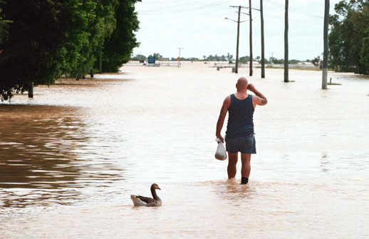 It never rains but it pours: Norm and his pet goose paddle home from the pub to feed the chooks.