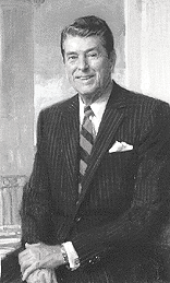 Al final de sus dos términos en el cargo, Ronald Reagan vio con satisfacción los logros de su programa innovador conocido como la revolución de Reagan, la cual alcanzó revigorizar a la gente americana y a reducir su necesidad sobre el gobierno. El sintió que había satisfecho su compromiso de campaña para el año 1980 de restablecer "El grande y confidente rugido del progreso americano, el crecimiento y el optimismo". En el 6 de febrero de 1911, Ronald Wilson Reagan nació de Nelle y John Reagan en Tampico, Illinois. El asistió a la Escuela Superior en el cercano Dixon y después trabajó a su manera a través de la Universidad de Eureka. Allí, él estudió economía y sociología, jugó en el equipo del Fútbol Americano, y actuó en obras de la escuela. Despues de la graduación, se convirtió en anunciador de deportes en la radio. Una prueba para la televisión en 1937, le ganó un contrato en Hollywood. Durante las dos próximas décadas, apareció en 53 películas. Tiene dos hijos, Maureen y Michael, de su primer matrimonio, con la actriz Jane Wyman. En 1952 se casó con Nancy Davis, también actriz; sus hijos son Patricia Ann y Ronald Prescott. Como Presidente del Gremio de Actores de la Pantalla, Reagan se envolvió en conflictos sobre el asunto del comunismo en la industria del cine; sus opiniones políticas cambiaron de liberal a conservador. Viajó el país como anfitrión principal de la televisión, convirtiéndose un portavoz para el conservadurismo.