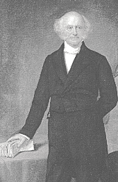 Con solamente cerca de 5 pies y 6 pulgadas de alto, pero el con buen porte y erguido, Martin Van Buren vestía fastuosamente. Su aspecto impecable reflejaba su amabilidad -- y su humilde procedencia. De descendencia holandesa, nació en 1782, el hijo de un tabernero y una granjera, en Kinderhook, Nueva York. Siendo un joven abogado, se envolvió en la política de Nueva York. Como líder de la " Estancia Albany", una efectiva organización política de Nueva York, él hábilmente proveyó de oficinas públicas y de su generosidad en una manera calculada para traer votos. Mientras satisfizo fielmente sus deberes oficiales, y en 1821 fue elegido al senado de Estados Unidos. Para el 1827 había emergido como el líder norteño principal para Andrew Jackson. El Presidente Jackson recompensó a Van Buren designándolo Secretario de Estado. Mientras que los miembros del Gabinete señalaban hacia la recomendación de John C. Calhoun y comenzaron solamente a demostrar lealtad secundaria a Jackson, Van Buren emergió como el consejero confiable del presidente. Jackson se refirió a el como, " un hombre verdadero sin nada que esconder". La diferencia en el gabinete llegó a ser seria debido a las diferencias de Jackson con Calhoun, aspirante presidencial. Van Buren sugirió una salida al eventual impasse: el y el Secretario de Guerra Eaton renunciaron, de modo que los hombres de Calhoun también debian renunciar. Jackson designó un gabinete nuevo, e intentó otra vez recompensar a Van Buren designándolo ministro a gran Gran Bretaña. El Vice Presidente Calhoun, como presidente del senado, emitio el voto decisivo contra la medida-- y hecho un lado las aspiraciones de Van Buren.