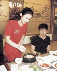 It has 10 tables with BBQ oven, entertains 40 guests, I visited them on 17th March, 2004. I took pibimbap (HK$95), cold noodle (HK$80) and ginseng soup (HK$150). For your information, they offers budget set lunch (HK$30) by 17:00, you can select Chicken, Beef or Porky rice with kimchi, and turnip soup. |