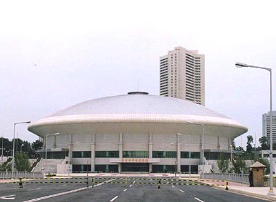鄭周永體育館 Between Ryugyong Hotel and Potonggang river, beside KISIU 24 hours Hamburgers Shop. 在柳京飯店及普通江之間,旁邊是金日城綜合大學經營的夾肉包快餐廳。 Opened