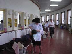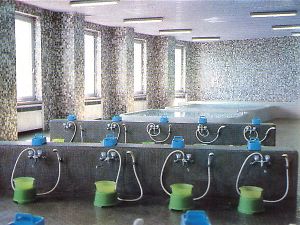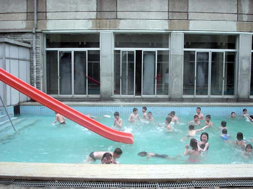 At Chollima street, beside Potonggang river, just beside 17 stories Potonggang Hotel, erected a 4 stories Changgwangwon health complex, it was opened in March, 1980, 380,000m2 area. The first and fourth floors are full of individual bath tubs and family bath pools; second and third floors are male and female public bathing area respectively, you may cruising in this area to enjoy a more close contact with Korean. Apart from bathing, it has warm and cool pools, steam room, 2 stories swimming hall with 2 jumbo size playing pools and 10m jumping pool and barbershop, its service hours is from 10:00 to 18:00, close on Wednesday. Recently, two similar health complex are opened, they are Rangnangwon(November, 2000) in south Pyongyang and Royal Favour(April, 2001) in ??? district, however, I don't have information, if you can provide, please feel free to email.