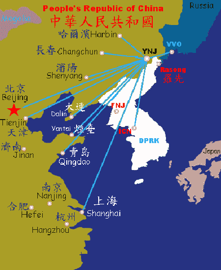 北京(PEK)、長春(CGQ)、大連(DLC)、漢城(SEL)、瀋陽(SHE)、烟臺(YNT)