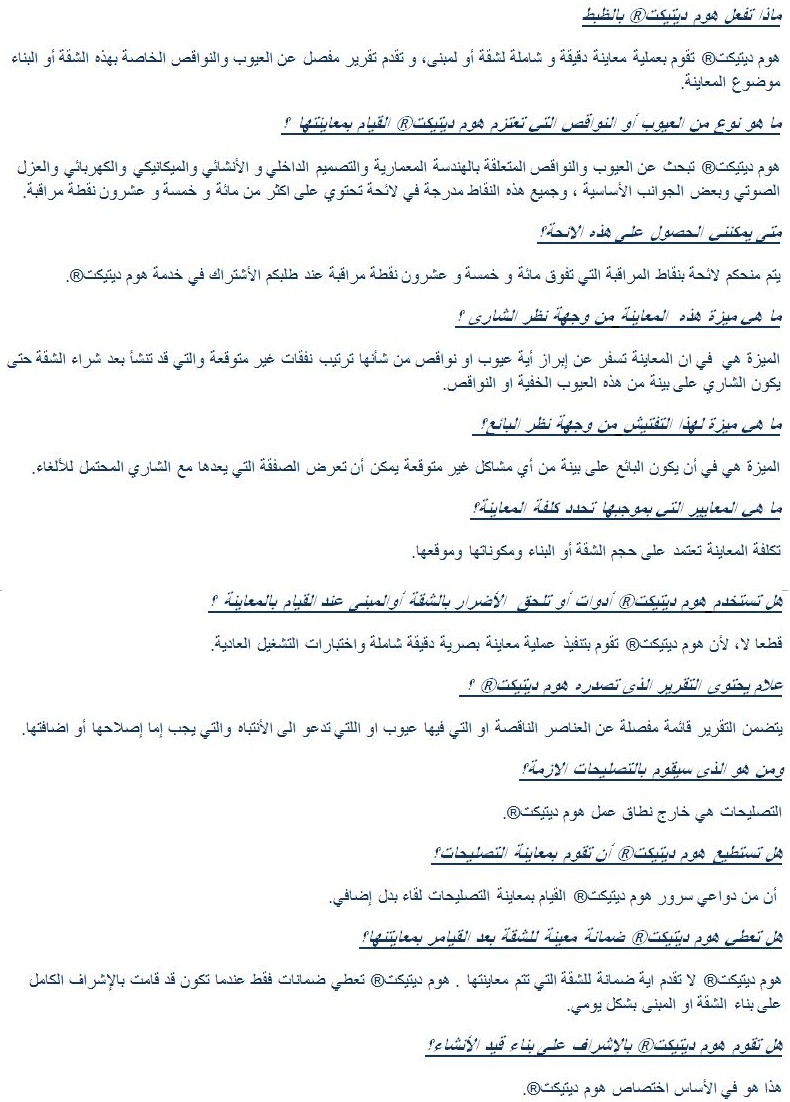 هوم دﻳتكت® | الصفحة الرئيسية | أنواع المعاينة | نطاق المعاينة | فحوى التقرير | الاسئلة المتداولة | خدمات أخرى | إﺘصل بنا