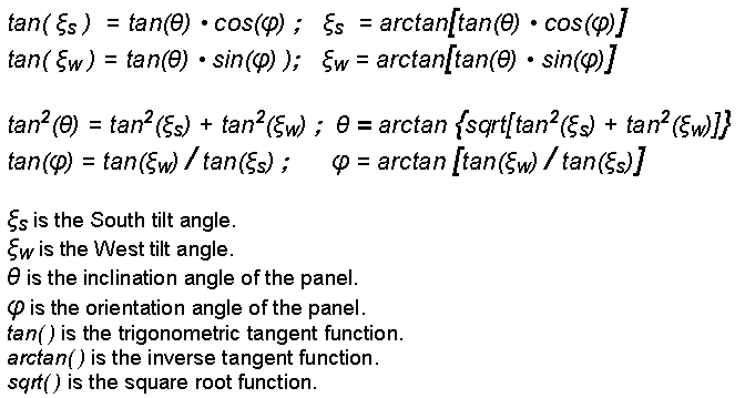 | As an example, a panel with a 3-12 pitch would have an inclination angle of tan(3/12)=14 degrees and an orientation angle of 45 degrees would have a South tilt of 11 degrees and a West tilt of 11 degrees. |