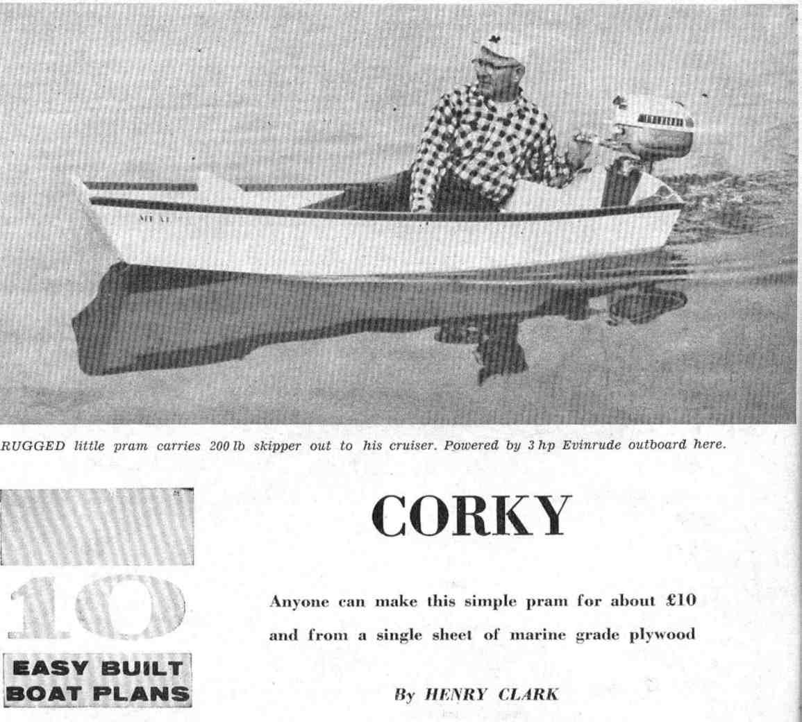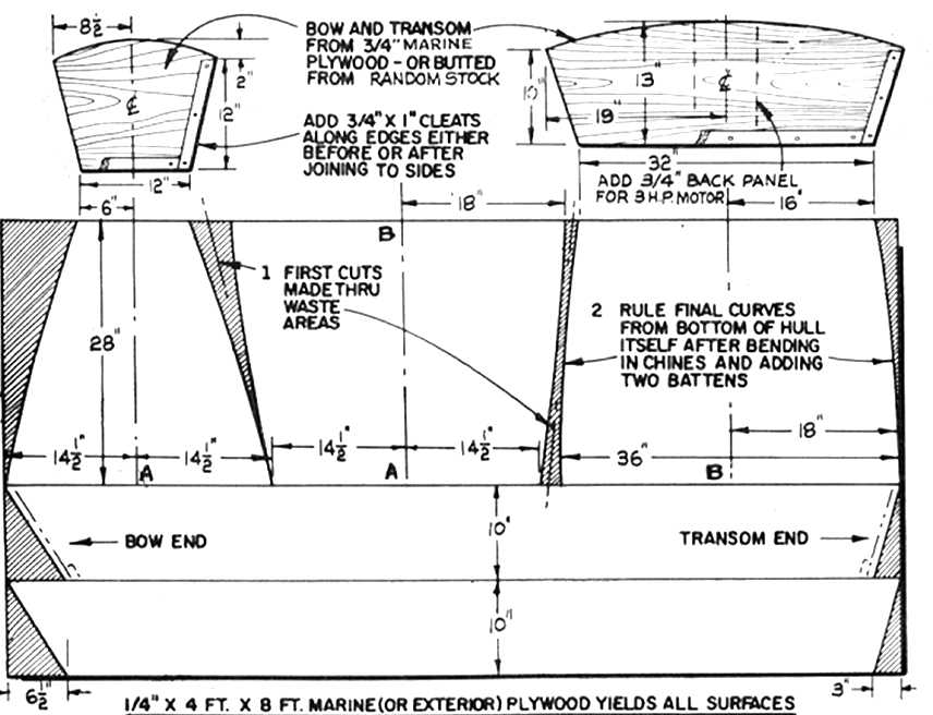 | 1. Here is a 40-year-old design by Henry Clark for a simple plywood pram dinghy. The sides and bottom will come out of a single 8' x 4' sheet of 1/4" plywood. It would be an ideal stitch-and-glue project. |