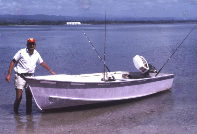 | In 1974, I went to live in Wewak, the capital of Papua New Guinea's East Sepik Province. At that time, it was still the East Sepik District and there was no Papua New Guinea. In 1975, this new country was formed out of the Australian Territory of Papua and the United Nations Trust Territory of New Guinea. I soon realised that in Wewak I would have plenty of spare time after six minutes past four every week-day evening and the whole weekend too, with very few ways of spending that time unless I developed a new interest. I wanted to get out onto the Bismarck Sea, within 10 metres of my doorstep, to fish, perhaps to dive and just for the fun and relaxation of being on the water. I decided to design and build a boat. On a piece of white cardboard that had once stiffened a new boxed shirt, I made a scale drawing of a v-bottomed hull planing hull, four-and-half metres long and nearly two metres wide. The drawing was rather crude, but it showed a conic projection of the bottom and the corresponding curvature of the frames needed to ensure that plywood would wrap around the hull properly. I started to order materials, tools and an engine. Plywood, monel nails, brass screws, glue, paint and marine plywood were all available at the local Burns Philp hardware store. I asked for quarter-inch (6mm) plywood, but did not notice until construction was well under way that the store delivered three-sixteenth-inch (4.5 mm) plywood; more about this later. There was a delay in getting timber to make the keel, frames, chines, gunwales, beams, stem and seats. Eventually Harry Dzueric delivered the timber -- beautiful lengths of dressed, seasoned rosewood. John Niblet, a friend from Lae, perhaps 1000 miles around the coast, helped me by purchasing and shipping to me a pair of oars with rowlocks and a set of hand-tools. As I recall, there was a large steel L-square, a steel tape-measure, a hammer, several clamps of different kinds, a brace-and-bit, a plane, a surform file, two handsaws and a couple of screwdrivers. Somewhere along the way I acquired an electric drill with a sanding disc and a set of drill bits. In due course the boat was finished and painted, but still there was no motor. Eventually the local agent delivered the 25 h.p. pull-start outboard that I had ordered many months before. Not having a trailer, I decided to keep the boat moored in a shallow lagoon just near the house. It was very convenient to wade out, hop into the boat, start the motor, let go the mooring and be out into the open sea in almost no time at all. The bottom of the boat was anti-fouled and it floated so high that the motor would tilt up completely out of the water, safe from the risk of corrosion. I discovered the hard way that there was one problem with the mooring, which was an old rusted engine block. One day, when there was almost no current and a spring tide, the boat settled onto the mooring. The rusted metal soon punched holes in the bottom so that the boat continued to lie on the ground as the tide rose. Fortunately I noticed what had happened well before high tide; I was able to beach the boat and, eventually, repair the bottom. To prevent this happening again, I found another heavy lump of scrap metal and from then on tied the boat fore and aft between the two moorings. I was very pleased with my design. To my eye its sweeping sheer and elegantly crowned foredeck were set off nicely by its somewhat unusual colour-scheme: white inside with a lilac topsides and foredeck. The sheerline was accentuated by a rub-rail which was somewhere between mauve and royal blue. The boat performed to my satisfaction. At rest it was a stable fishing platform, because it was so beamy. It threw very little spray and tracked well in a following sea. It was quite bumpy heading into a chop, but this could be minimised by easing back on the throttle and putting someone well forward to keep the nose down. There was one fault: because the plywood was so thin, the bottom would flop in and out in a most alarming fashion as the boat ran along. I should have used two layers of quarter-inch plywood instead of one layer of three-sixteenths. Fortunately, the boat kept on holding together. |
