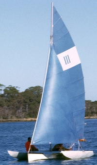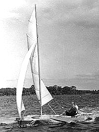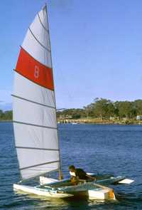 There were sailing boats at Paynesville too, but they were too slow to attract my interest, until one Saturday afternoon I saw something that moved like a speedboat with sails. From a distance of half a kilometre or so I could see a huge plume of spray arcing out from either side of the boat as it rocketed towards Montague Point in a gust of wind. I wanted to be on that boat. |