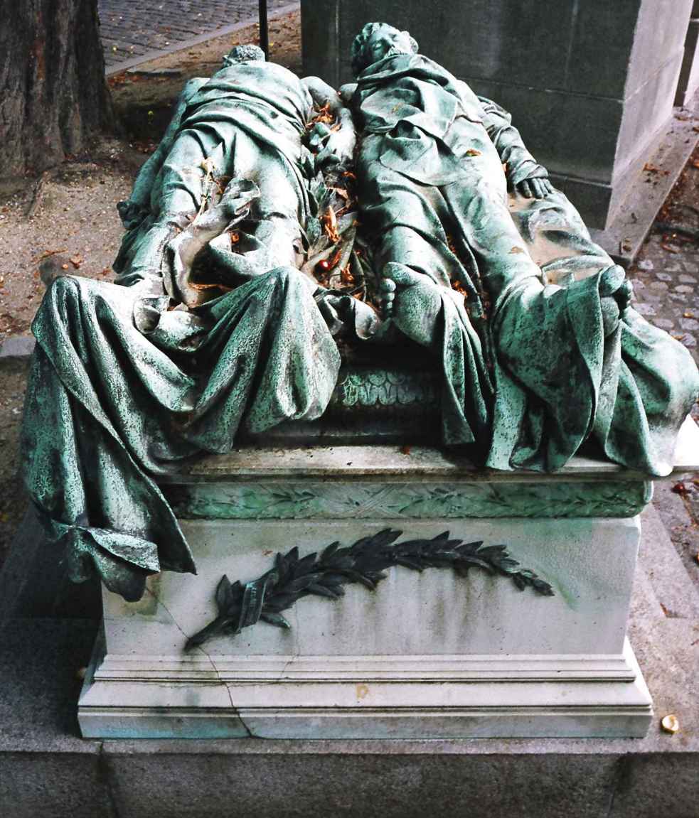 | Another two sharing a tomb are Croce-Spinelli and Sivel, pioneering French balloonists. On 15 April 1875 they died together in a ballooning accident more than 8,600 metres over France: the air grew too thin and they were asphyxiated. The scientific world was greatly shocked by this tragedy, which put an end to high altitude flights for the next 20 years. They were buried together in the tomb you can see here. The monument surmounting the tomb is one of the most talked-about in the cemetery, for a reason that should be fairly obvious. |