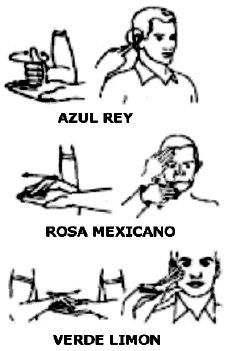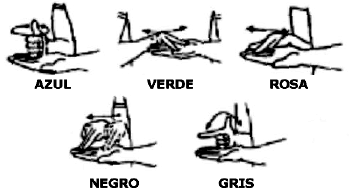 Los ideogramas para los colores "azul", "verde", "rosa", "negro" y gris se ejecutan con ambas manos; una mano simula mezclar pintura sobre la palma extendida de la otra.