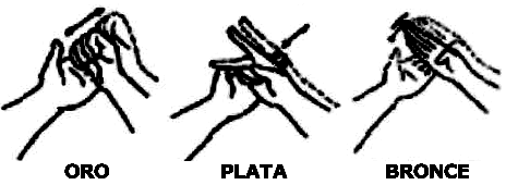 Los ideogramas para los colores "oro", "plata" y "bronce" son los mismos que se utilizan para los metales del mismo nombre. Estos ideogramas se realizan golpeando la palma extendida de la mano, lo que denota que su significado está relacionado con el concepto de "valor".