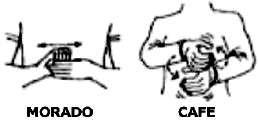 Las señas para "morado" y para "café" (color y bebida) se realizan sobre la parte lateral de la mano.
