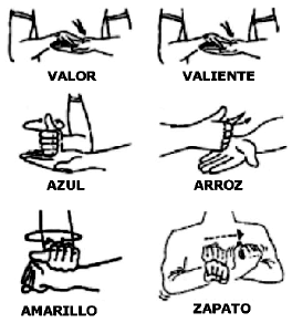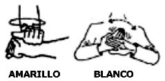 Los ideogramas para "amarillo" y "blanco" se realizan sobre el dorso de la mano.