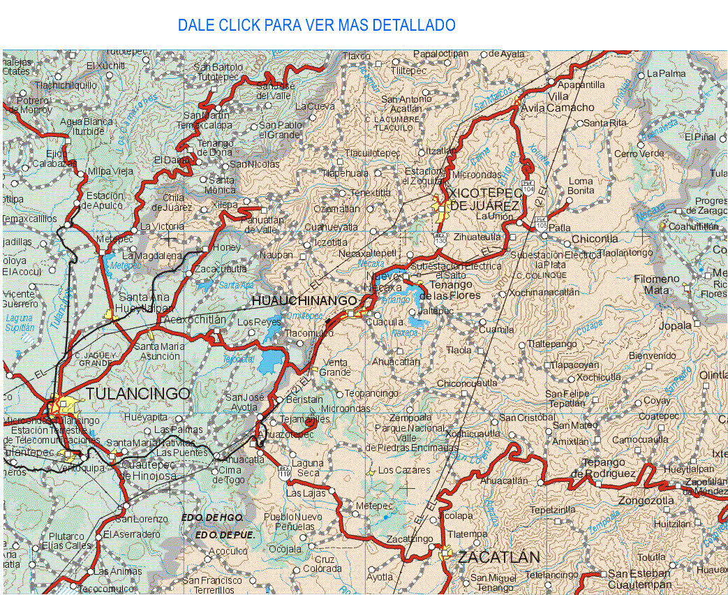 En la mapa se puede observar en forma mas detallada, la ubicacion de la ciudad de Huauchinango,y sus alrededores, tambien en esta mapa se ubica las presas de Necaxa,Tenango,Nexapa,etc