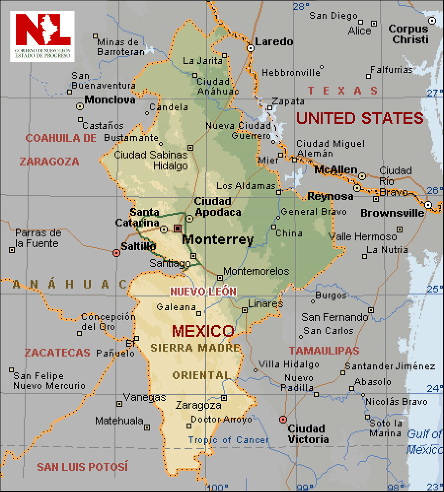 Área (km 2 ): 64,210 km2 que representa el 3.3% de la superficie total del país. Límites: Al norte colinda con Coahuila y Tamaulipas; al sur, con San Luis Potosí y Tamaulipas, estado que comparte todo su límite por el este. Coahuila, San Luis Potosí y Zacatecas por el oeste (en el vértice de los límites de los cuatro estados). Nuevo León cuenta con una zona fronteriza, con el municipio de Colombia que colinda al norte con Texas (EUA). Atlas de México SEP Educación Primaria, Instituto Nacional de Estadística, Geografía e Informática. Anuario Estadístico de los Estados Unidos Mexicanos 1997, México 1998. |